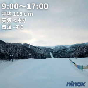 | 滑走状況 | 一部可能[△] | 天気 | 曇 | 気温 | -2℃ | 雪質 | 人工雪 | 積雪 | 25cm |